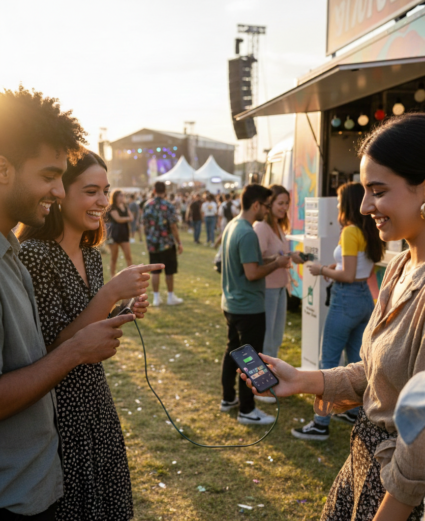 Shared power banks allow attendees to charge while moving, keeping energy high and queues low.